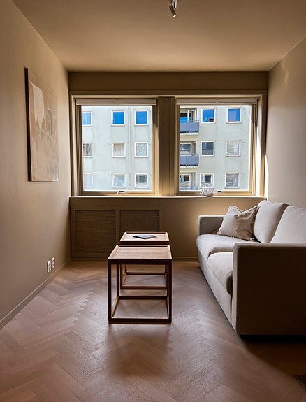 Stue: Lys og pen stue. Møblert med sovesofa, sofabord og stol.