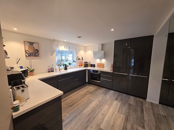 Kjøkkenet er utstyrt med gode skap- og lagringsmuligheter.