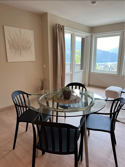 Lys og arealeffektiv leilighet fra 2012 med gjennomgående god standard, flott utsikt og solrik beliggenhet. Leiligheten ligger i høy første etasje (carport under), uten innsyn, og passer perfekt for deg som ønsker et rolig og moderne hjem med kort avstand til Sogndal sentrum.