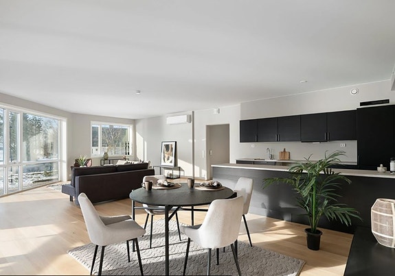 Vannbåren varme med viftekonvektor i stue/kjøkken og elektriske varmekabler i bad.