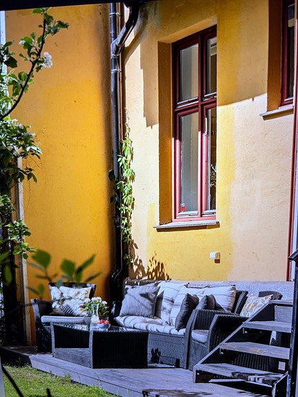 Bakgården har gjesteparkering hvor man kan stå i et par timer, lekeplass og sitteplasser.
