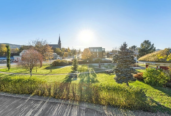 Den befinner seg 30 sekunder fra bussholdeplass og i gangavstand til matvarebutikk,skole ,frisører og restaurant rett over veien og med legesenteret i første etasje.