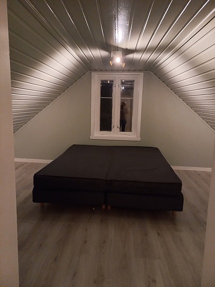 Det følger med vaskemaskin på bad og integrert komfyr og oppvaskmaskin. Har eventuelt 1 lite kjøleskap om ønskelig. Oljeovn i stua og om ønskelig kan det følge med panelovn.