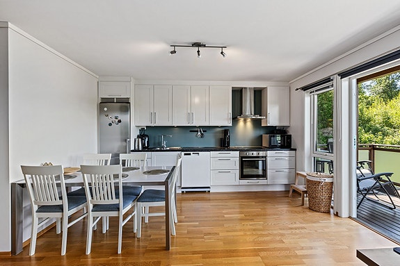 Hyggelig entre med plass til oppheng av yttertøy og sko. Gangen fører ut til en lys og trivelig stue med åpen kjøkkenløsning. Ett romslig kjøkken med grå benkeplate og hvite skapdører, god benke- og skapplass. Kjøkkenet er innredet med kjøleskap/frys, oppvaskmaskin, vask og integrert komfyr og koketopp. Her er god det plass til spisebord med tilhørende stoler. I stuen er det god plass til sofagruppe med direkte utgang til balkong. Balkongen har en flott utsikt, vestvendt beliggenhet med kveldssol. Leiligheten har to fine soverom. Det ene soverommet har plass til en enkeltseng og et skrivbord eller en liten dobbeltseng. Det andre soverommet er svært romslig og har et stort garderobeskap og ellers god plass til en dobbeltseng. Hyggelig bad med hvite fliser på veggene og grå fliser på gulvet. Det er innredet med dusjkabinett, innredning og toalett. Opplegg for vaskemaskin/tørketrommel.