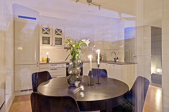 Innvendig er det parkettgulv, moderne veggfarger og smakfull, klassisk innredning. Planløsningen er gjennomtenkt, med en hyggelig stue og et kjøkken i delvis åpen løsning.