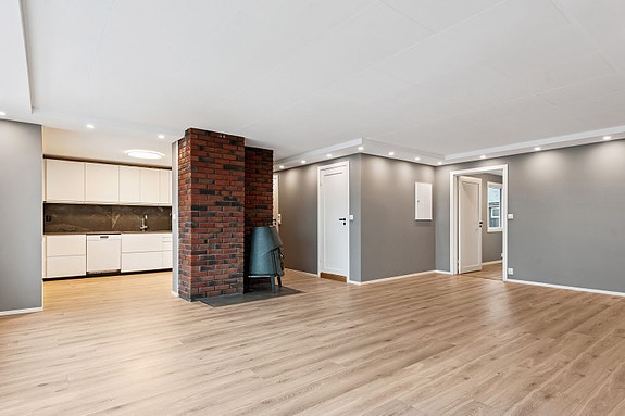Stue og kjøkken i delvis åpen løsning. Peisen varmer godt på kalde dager