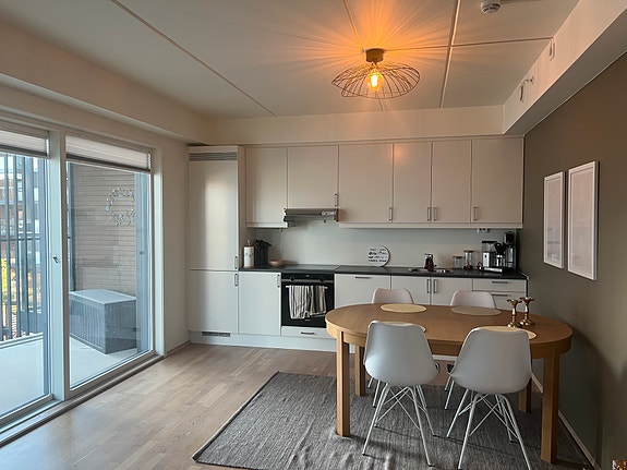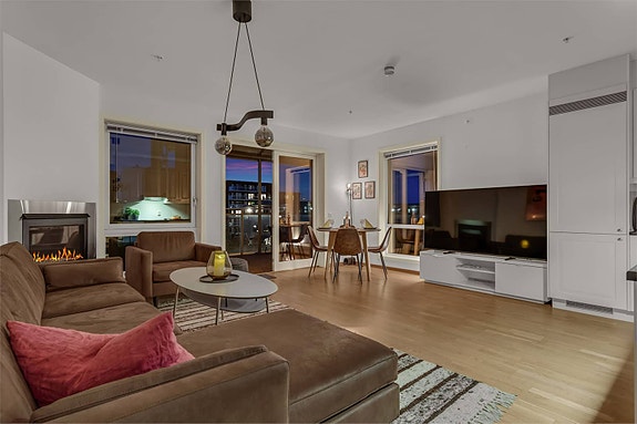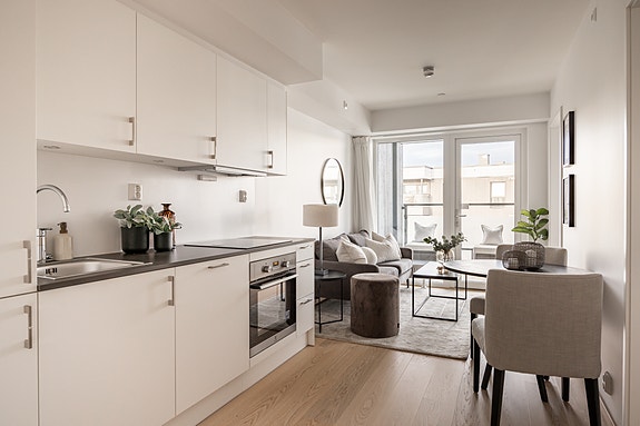 Stue og kjøkken i åpen løsning skaper et sosialt allrom som egner seg perfekt for gjester. Her er det god plass til sofagruppe og stuebord i en egen sone, samtidig som du har nærhet til kjøkkenet. Store vindusflater i enden av rommet gir rikelig lysinnslipp, og gjennom en skyvedør i glass har du direkte utgang til leilighetens terrasse.