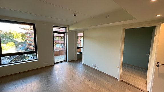 Lys og romslig stue med store vindusflater som gir rikelig dagslys. Her er det god plass til sofa, TV-benk og spisebord. Fra stuen har du direkte utgang til en stor balkong – ideell for grill og hyggelige utemiddager, kveldsol. Lys 1-stavs eikeparkett gir et elegant preg i hele leiligheten.