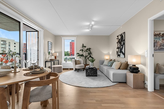 Nyere, tiltalende og modere 4-roms hjørneleilighet i byggets 6. etasje. Leiligheten er helt strøken med gjennomgående fine lyse flater i alle rom, to bad, og to solrike terrasser.