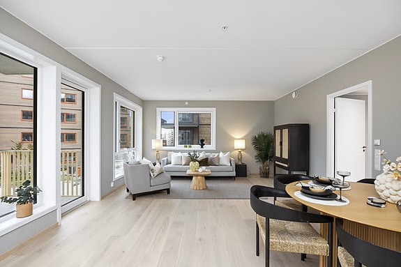 En lekker og moderne 3-roms med attraktiv beliggenhet, bygg fra 2025 og en svært høy standard. her får du alt du har behov for i nærområdet, og en lekker leilighet med en sjarmerende balkong. Leiligheten er umøblert og klar for innflytting i februar.