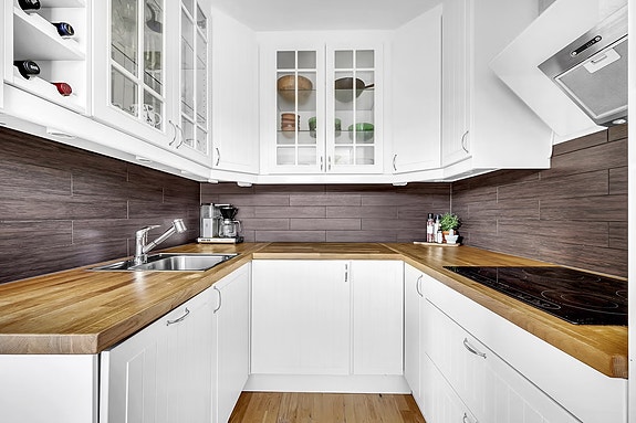 Pent Ikea-kjøkken med god skap- og benkeplass