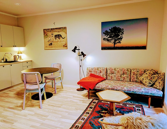 Området er spesielt flott for tur i skog og hei, eller morgenbad i Eikevannet. Der er i tillegg en veldig fin uteplass og hage. Hybelen er møblert, men dette kan fjernes etter behov. Har du dyr, så finner vi nok ut av det også.