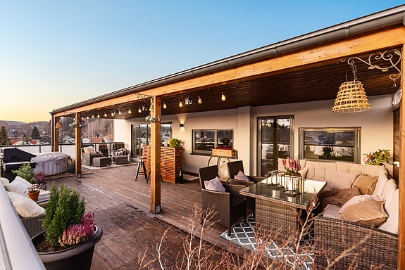Terrassen med delvis dekket av tak, intet innsyn fra andre.