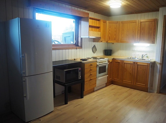 Stort kjøleskap med frys, komfyr, mikrobølgeovn, vaskemaskin, varmepumpe.