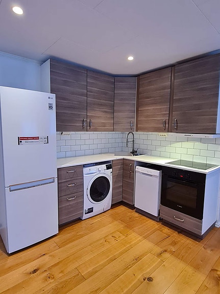 Hvitevarer medfølger (kjøleskap, komfyr med keramisk topp, vaskemaskin, liten oppvaskmaskin)