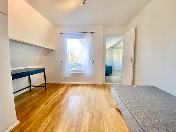 Fint og lyst soverom, på 13kvm, med garderobeskap. Møblene følger med om ønskelig