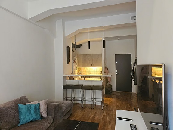 Boligen byr på en åpen og sosial stue-/kjøkkenløsning med barbenk og integrerte hvitevarer, et romslig soverom og et stilrent, flislagt bad med dusjkabinett og vaskemaskin.