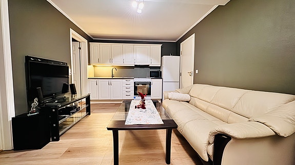 Møblert med 120cm seng, Ekornes skinnsofa, 2 in1 vaske/tørk vaskemaskin, kjøleskap med fryse, 40'' LED-TV flatskjerm med surround anlegg, kleskap og mye mer...