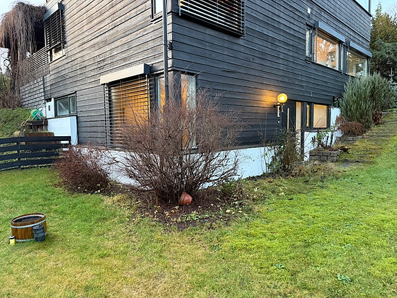 Hybelen ligger i en rolig gate, egen utgang og egen hageflekk. Den fremstår som både lys og trivelig med store vindusflater.