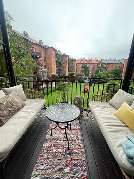 Vestvendt balkong (ca. 4 m²) mot frodig bakgård