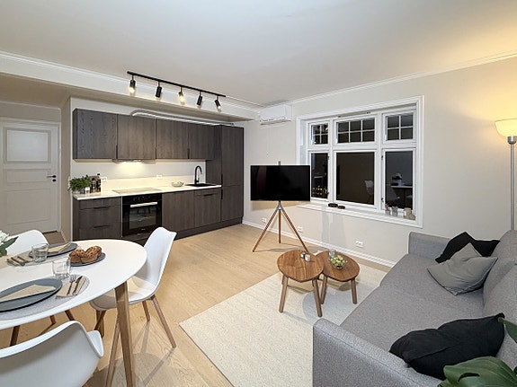 Hele bygget er totalrenovert i 2025. Vegger er etterisolert, og det er etablert lydhimling mellom etasjene for god bokomfort. Leiligheten har nytt kjøkken med kvalitetshvitevarer fra Miele, samt Toshiba varmepumpe for energieffektiv oppvarming og kjøling.