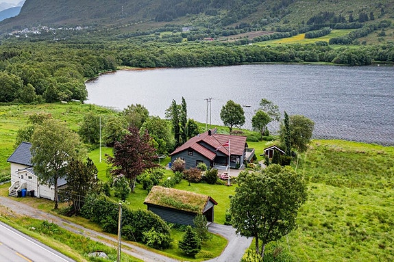 Bilde av eiendom fra luften. Disponibel garasje m/torvtak ved riksvegen. Steinlagt ankomst til sokkelleilighet på høyresiden av huset ned mot den røde hytten i hagen.