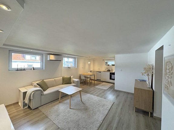 Vi leier nå ut en pen og innbydende kjellerleilighet i enebolig, beliggende i et rolig og attraktivt område i Sandnes. Leiligheten har egen inngang, gjennomgående god standard og leies ut fullt møblert. Her får du to soverom, åpen og luftig stue-/kjøkkenløsning, eget vaskerom samt tilgang til en stor og grønn hage med nydelig sjøutsikt.
