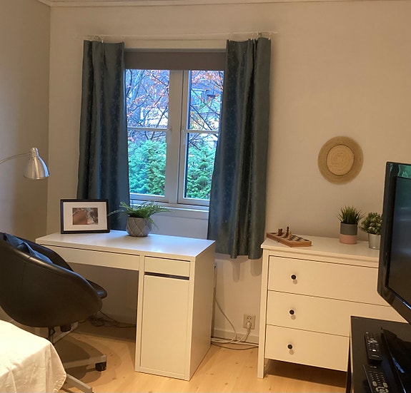 Hyggelig terrasse med utemøbler mot hagen. Leies ut til 1 person, ingen røyk eller husdyr. Parkering på gaten i umiddelbar nærhet. Dersom du er interessert , setter vi pris på en mail med litt informasjon om deg selv. Visning etter avtale.