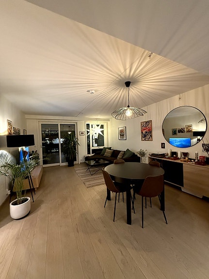 Lys og sosial sone med åpen løsning. Kjøkkenet er fullt utstyrt med alt du trenger, inkludert oppvaskmaskin, integrert ovn, induksjonstopp og kjøl/frys. Stuen er innredet med en stor, behagelig sofa, 55" TV og et praktisk uttrekkbart spisebord – perfekt for middagsgjester.