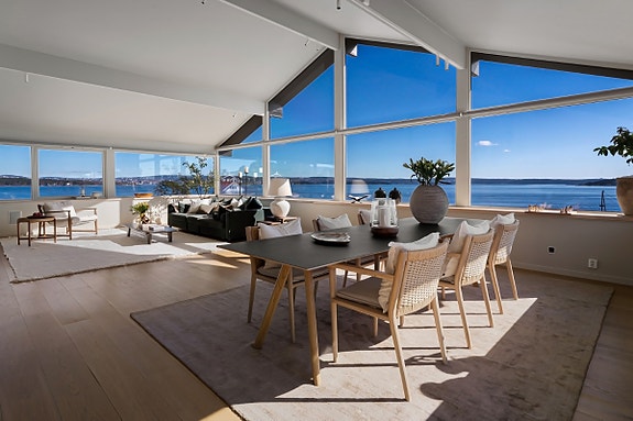 Stor toppleilighet over flere plan med fantastisk utsikt over fjorden, beliggende usjenert til i rolig blindvei, et steinkast fra vannet. Leies ut for 4-6 mnd, delvis møblert.