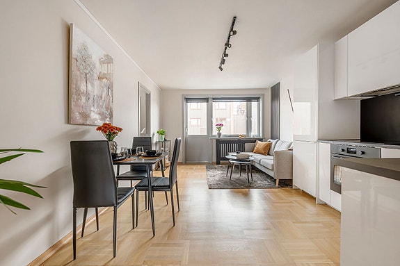 Leiligheten ble betydelig oppusset i 2022, og alle vegger er nymalt i 2025, noe som gir et moderne og velholdt inntrykk. Fra entréen kommer man videre inn i leilighetens stue som har åpen kjøkkenløsning. Her er det sofagruppe og mediemøblement, samt en spisegruppe. Leiligheten har en gjennomgående planløsning og store vindusflater som gir rikelig med naturlig lys. Fra stuen er det utgang til en hyggelig balkong med gode solforhold. Kjøkkenet har en praktisk og stilren utforming med slette fronter og benkeplate i laminat. Kjøkkenet er utstyrt med nedfelt oppvaskkum og ett‑greps blandebatteri, og har integrerte hvitevarer som platetopp, komfyr, mikrobølgeovn, kjøl‑/ fryseskap og oppvaskmaskin. Den åpne løsningen mot stuen gir en sosial og luftig atmosfære, og gjør kjøkkenet til en naturlig del av oppholdsrommet.