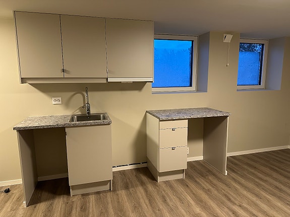 Helt ny ubrukt hybel med nye hvitevarer, her av komfyr, kjøleskap, oppvaskmaskin og vask/tørketrommel (kombinert). Hybelen er ca. 40m², ikke oppmålt foreløpig.