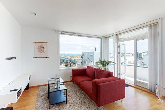 Nice apartment on the 4th floor. Contains hallway, tiled bathroom, bedroom, living room and kitchen in an open solution. From the living room you have access to a balcony. Lightly painted walls and large windows in the front provide plenty of light and a good feeling of space.