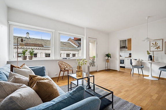 Innbydende og romslig stue med flere møbleringsmuligheter. Store vindusflater sikrer godt med lys inn i leiligheten og utgang til en trivelig balkong på ca 2 kvm. Stuen må sies å være hjertet av leiligheten og gir et flott totalinntrykk med en god atmosfære.