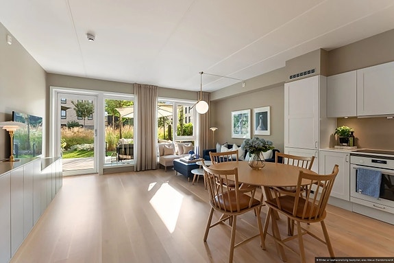 FORNEBU / OKSENØYA-Idyllisk og lekker 3-roms hageleilighet m/? solrik, lun terrasse på 29 m²| Garasje|Heis| Sjønært
