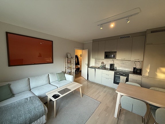 Leiligheten leies ut fullt møblert og velutstyrt, med alle hvitevarer, kombinert vaskemaskin/tørketrommel, TV, lydplanke, kaffemaskin, oppvaskmaskin m.m. Det er rikelig med oppbevaringsplass, samt tilgang til en hyggelig og sosial bakgård med sittegrupper og bordtennisbord.