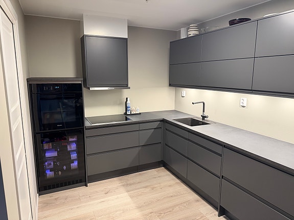Kjøkken med vinskap og kjøleskuff.