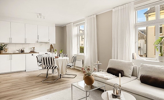 Stuen har god plass til både sofa og spisebord, og de store vinduene gir rikelig med naturlig lys. Kjøkkenet ligger åpent mot stuen og fungerer godt til både hverdagsbruk og sosiale sammenkomster. Begge soverommene er lyse og romslige. Badet er moderne med fliser, gulvvarme og opplegg for vaskemaskin.