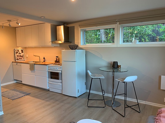 Leiligheten leies ut fullt møblert som på bildene. Kan diskuteres dersom leietaker har deler av møbleringen selv. Sengen er 120 cm bred. Sofa og salongbord, barstoler og barbord kan justeres i høyden. Klesskapet er 120 cm bredt.