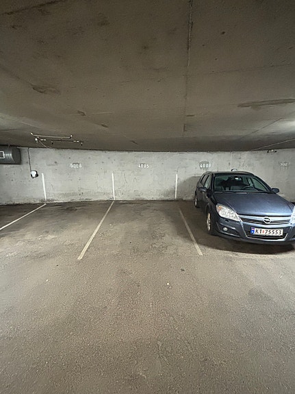 Dette er en romslig parkeringsplass uten søyler i veien, som gjør den enkel å manøvrere og parkere på.
