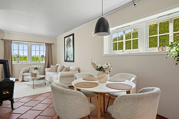 Stue og kjøkken ligger i åpen løsning og gir en luftig og sosial atmosfære. Stuen har vedovn og plass til både sofa- og spisegruppe.