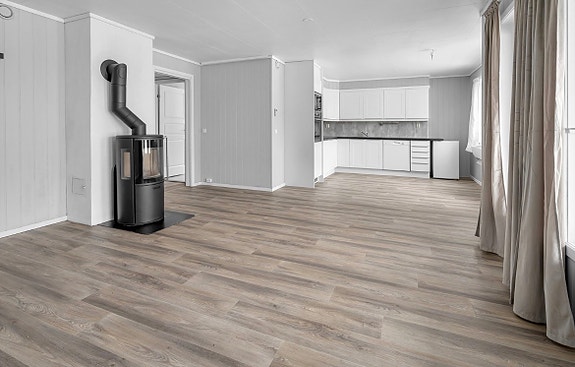 ✔ Åpen, lys stue med god plass til sofa og spisebord