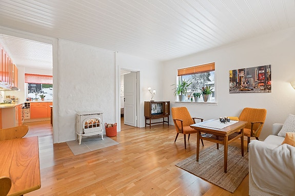 Lys stue med peisovn.