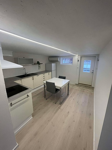 Det er et eget inngangsparti og parkeringsplass. Alle møbler som er med i bildene følger med boligen, samt en utebod til lagring.