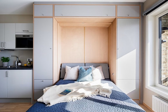 Hybelleiligheten har en praktisk planløsning med stue/kjøkken, bad og utgang til egen balkong. På kjøkkenet i hybelen er kjøkkeninnredningen i glatte fronter med laminat benkeplate med nedfelt kum i rustfritt stål. Integrert i innredningen er det induksjonstopp, integrert mikro, benkekjøleskap og kullfilterventilator.