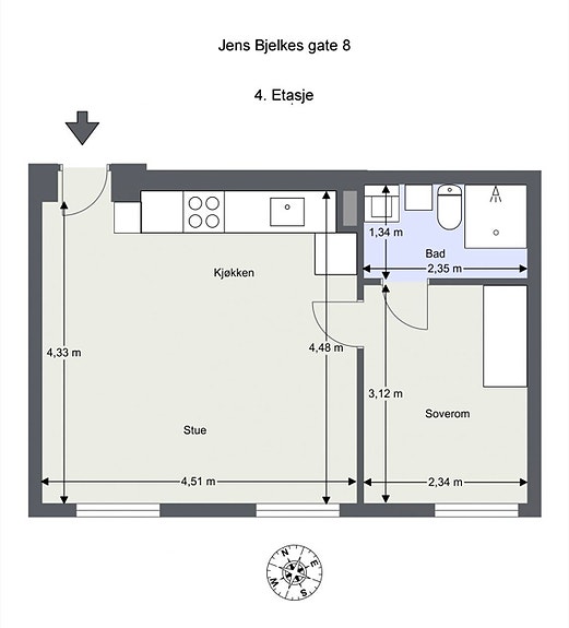 Entré med plass til sko og yttertøy, stue med god plass til sofahjørne og spisebord, åpen kjøkkenløsning med integrerte hvitevarer, soverom med plass til dobbeltseng samt lekkert flislagt baderom med dusjnisje, WC, servant, vaskemaskin og tørketrommel.