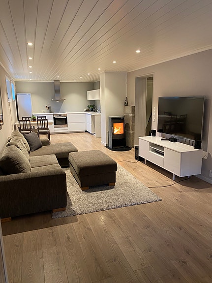 Leiligheten er møblert. Det er moderne vedovn. Stille og rolig område, landlig. Platting på utsiden med overbygg.