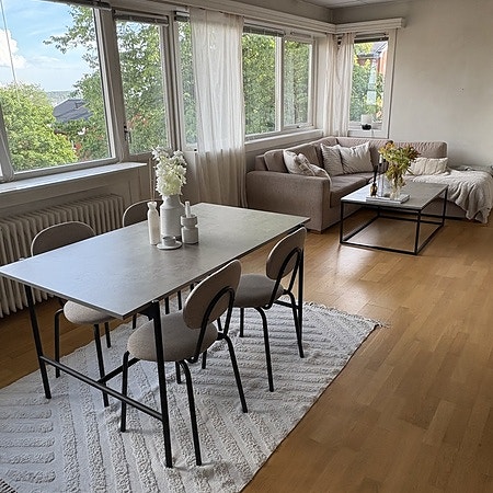 Leiligheten er på ca 90-100m2 og har 3 soverom, åpen kjøkken- og stueløsning, 1 bad, 1 toalett og en liten balkong. Det er vaskemaskin på badet, og tilgang til fellesvaskeri i kjelleren. Vi har også en romslig bod i kjelleren. Rommet som leies ut er umøblert, men det følger med klesskap. Det er plass til dobbeltseng, garderobe og skrivepult. Prisen inkluderer varmtvann og vannbåren varme, men inkluderer ikke strøm og internett. Prisen for strøm og internett har kommet på ca 500 per pers i måneden. I tillegg har leiligheten mange felles oppbevaringsmuligheter.