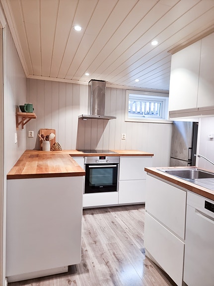 Kjøkken med hvitevarer, blant annet et stort kombi kjøleskap og helt ny oppvaskmaskin. Det finnes også en liten bod innenfor kjøkkenet.
