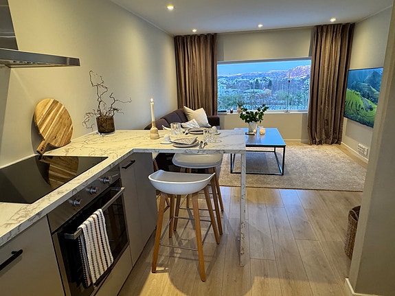 Vi leier ut en lys, moderne og svært innbydende leilighet, totalrenovert sommer/høst 2025. Leiligheten ligger i rolige omgivelser med flott utsikt mot byfjellene, egen hage og gode solforhold – perfekt for deg som ønsker en komfortabel bolig med høy standard for langtidsleie.